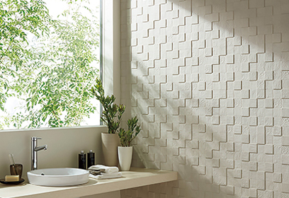 壁の一部にアクセントとして微妙な質感、色合いと形の組合せでさまざまな空間を演出することができます。