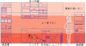 そこで、よく使うモノを無理のない高さに配置したいのですが、下の絵を見てもわかるように、使いやすい範囲はそずいぶんと限られています。そのため、収納はたくさんあっても使いにくい場所が多いので、モノが出たままになったり手前にしまったモノしか使わなくなるというわけです。