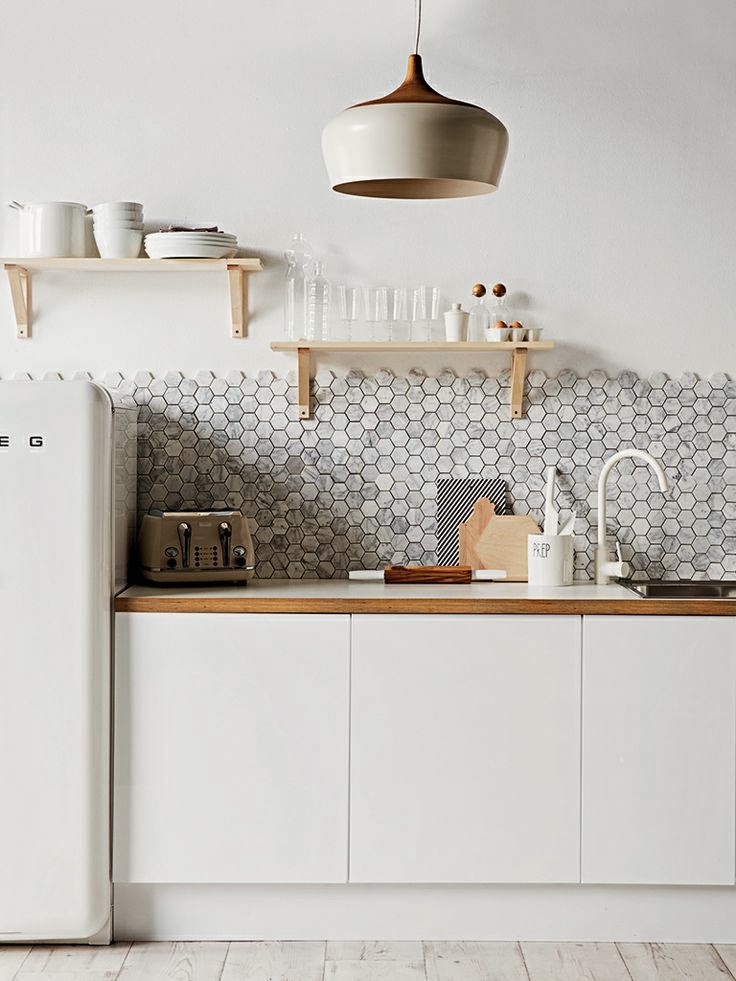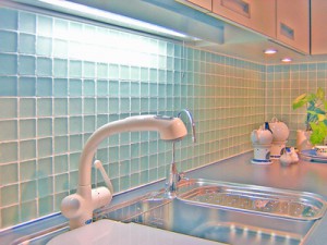 ガラスのモザイクタイルを使えば、キッチンの照明がキレイに