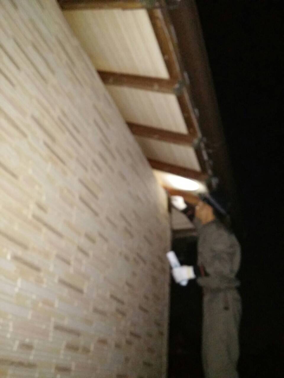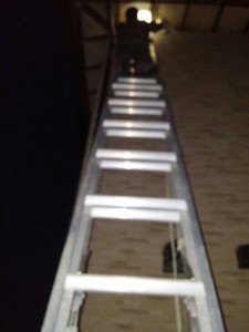 午後、コウモリが餌を取りに巣から出て行ったのを見はからって、2連梯子をかけて隙間を塞ぎました!