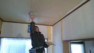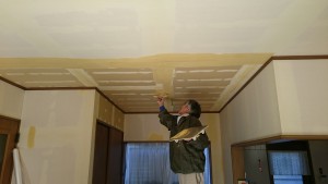 4/天井の新しいボード材の繋ぎ目(ジョイント)の面取り、もともとの繋ぎ目や段差のパテ処理を入れます!