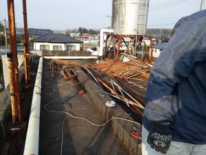 屋上にあった錆びついた鉄のフェンスの撤去、看板建ての撤去から工事は始まりました☆