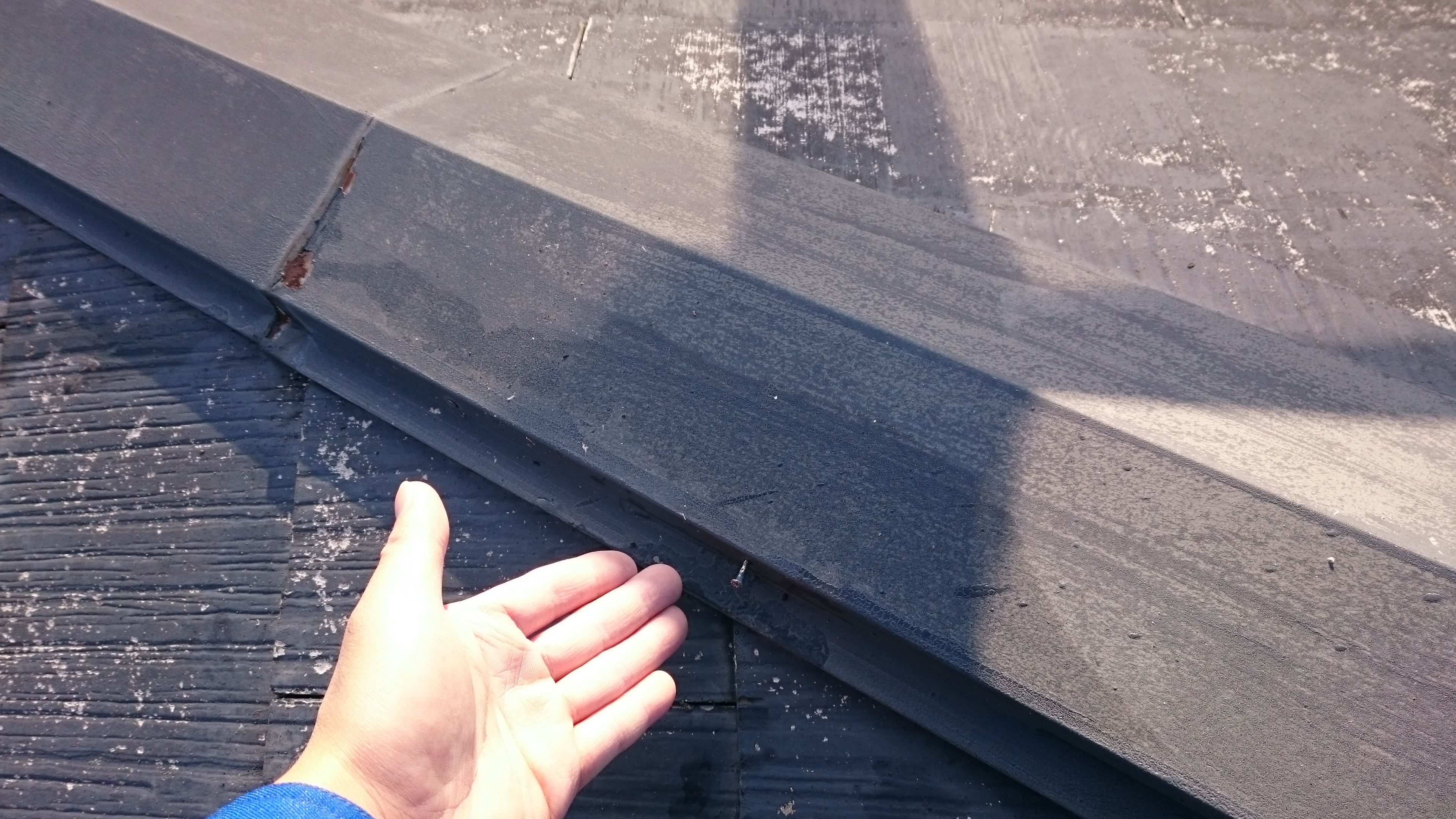 丁度棟板金のサイドの釘が浮いている状態でしたので、新しい釘を打ち直して更にコーキングで補修していただくよう職人さんにお願いしました(*^^*)