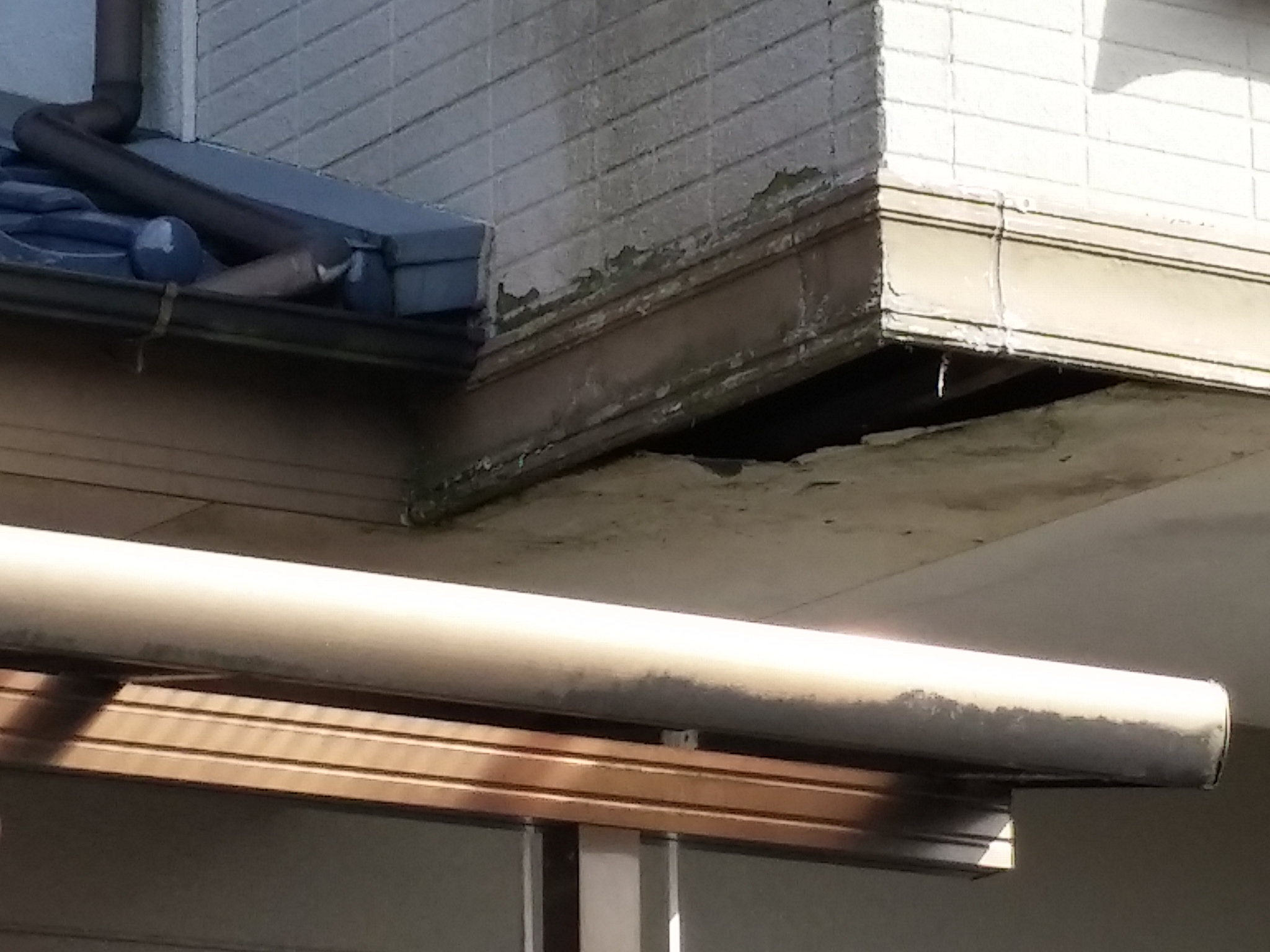 長い年月の間に「水」が侵入し、幕板はブヨブヨ、軒天は腐って落ちちゃってます(*_*)