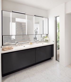 LIXILの洗面化粧台「ルミシス」は、ミラーもキャビネットもカウンターも、壁から壁へピッタリサイズのオーダーが可能