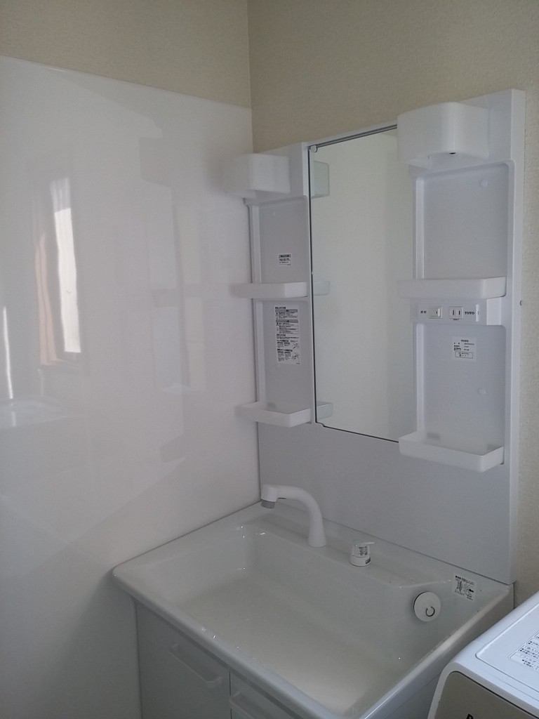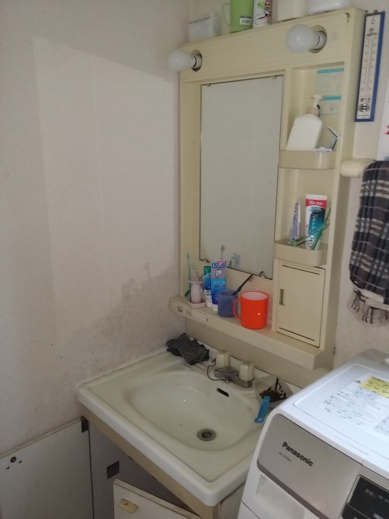 朝8:30に洗面台を撤去、9時にクロス職人さん到着、クッションフロアーとクロスの張り替え、クロス職人さん13時に終了、入れ替わりで設備屋さん到着、洗面台設置の流れでした✨