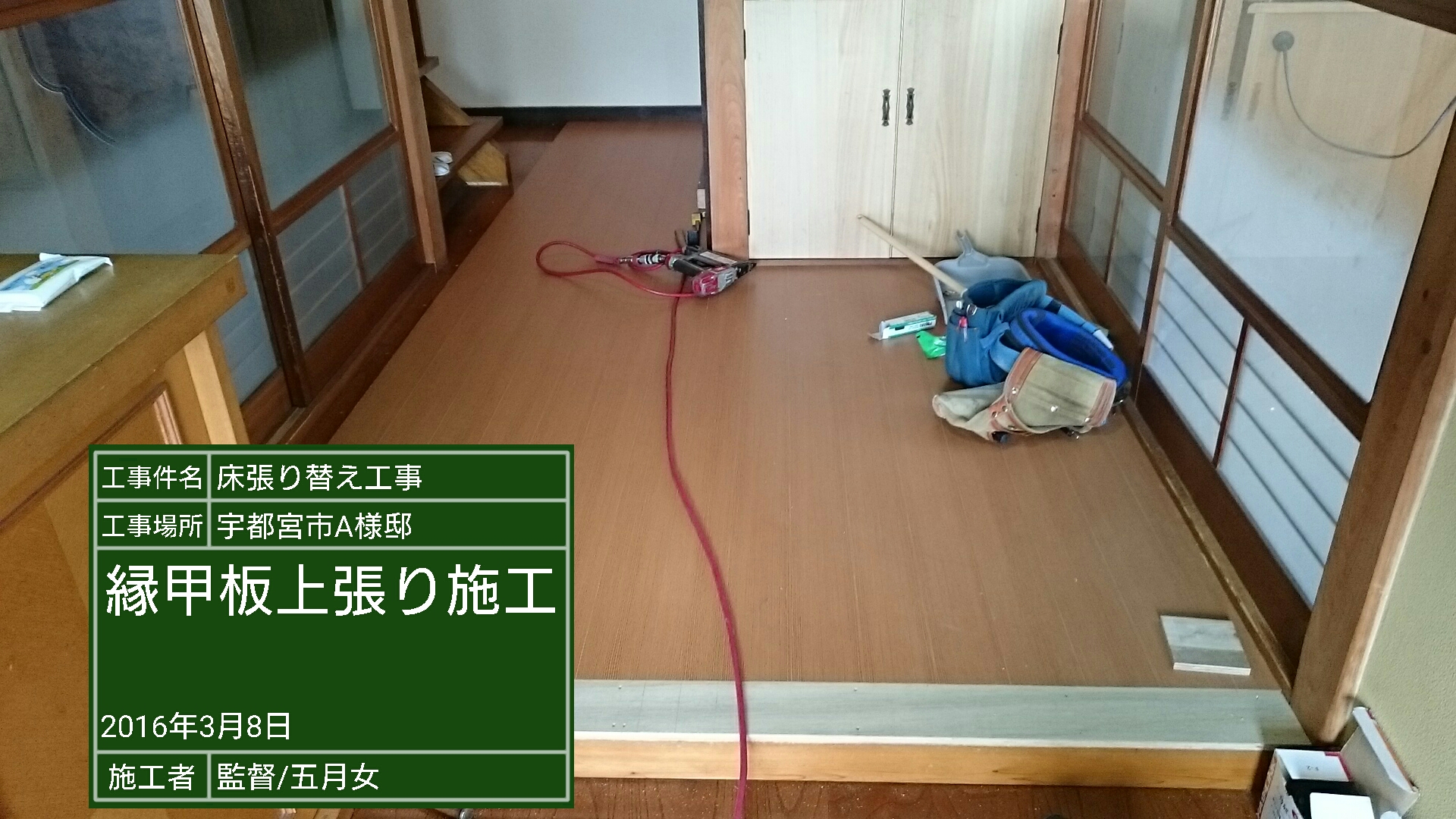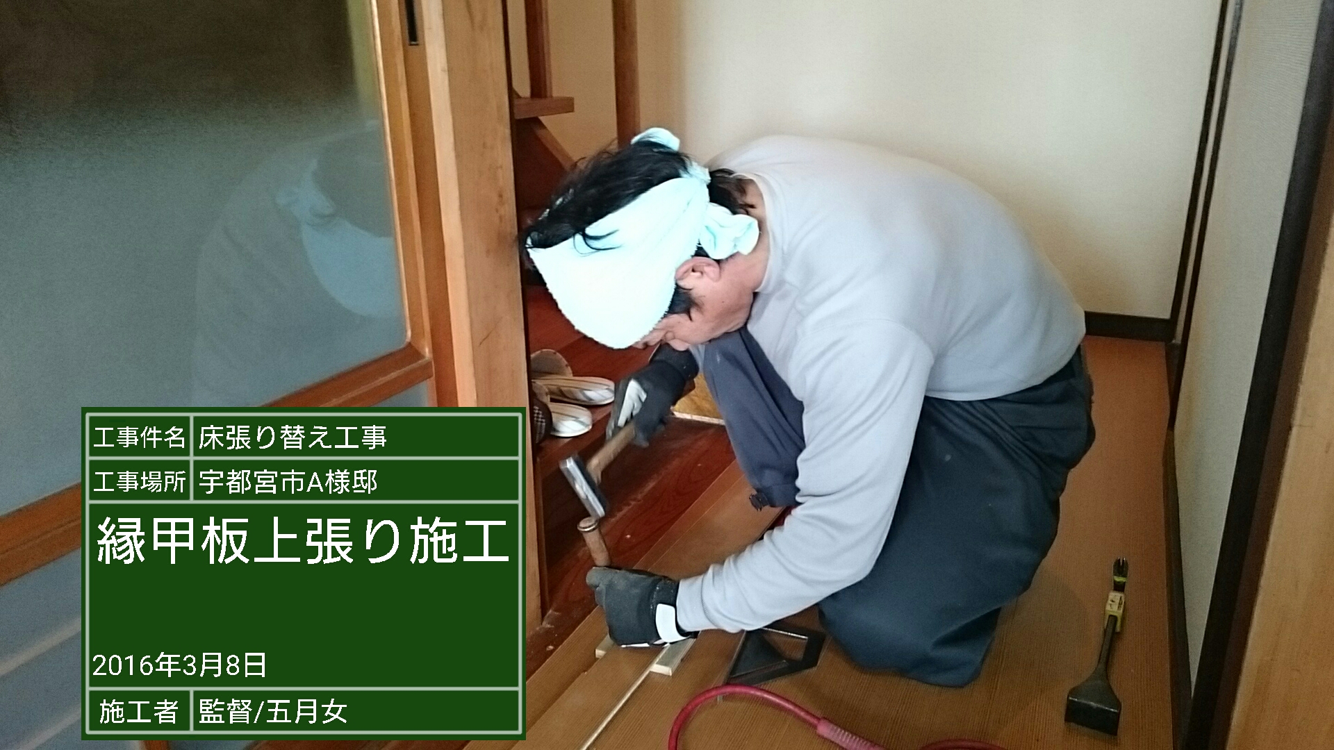 ※今回は上張り工事ですが、既存の幅木(床と壁の見切り)が、既存の床板の下に潜っている形状のタイプの構造がゆえ、壁をいじりませんので、縁甲板と框含め『突き付け』でのリフォームとなります!