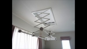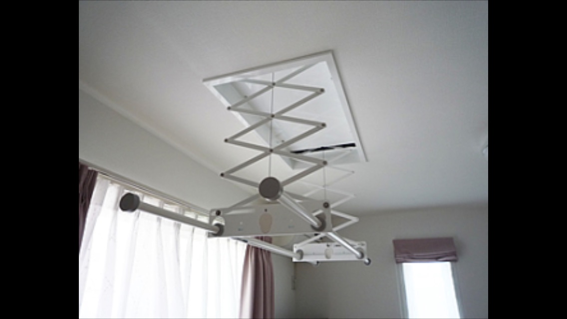 天井に収納していた竿が、ボタン一つで自動的に降下し、物干し竿が目の前に現れます。