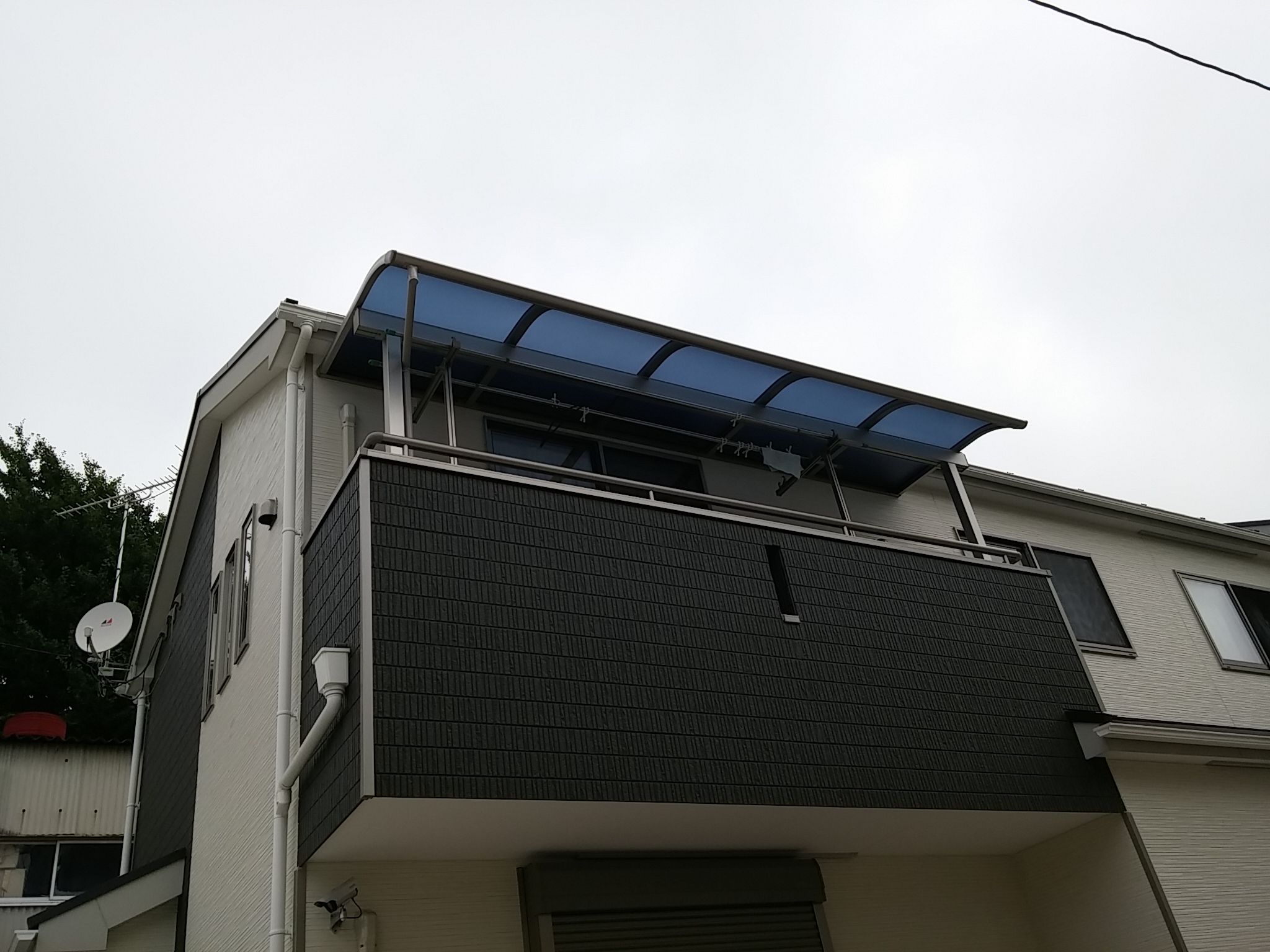S様のご希望で「夏は涼しくすごいたい😅」と言うことで、屋根ふき材は「熱線遮断ポリカ 色はアースブルー(マット)」を使用しました😄紫外線もほぼカットしてくれます✌