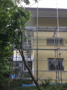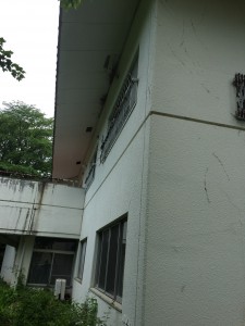 モルタルの外壁が所どころ落ちているため、塗装の前に下地作りで玉吹きをしてからの塗装です。