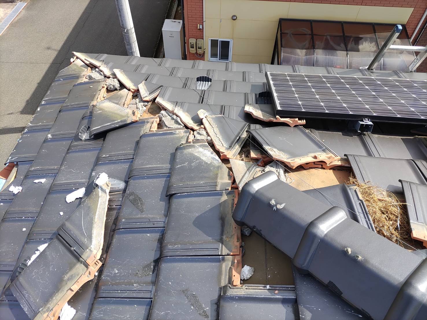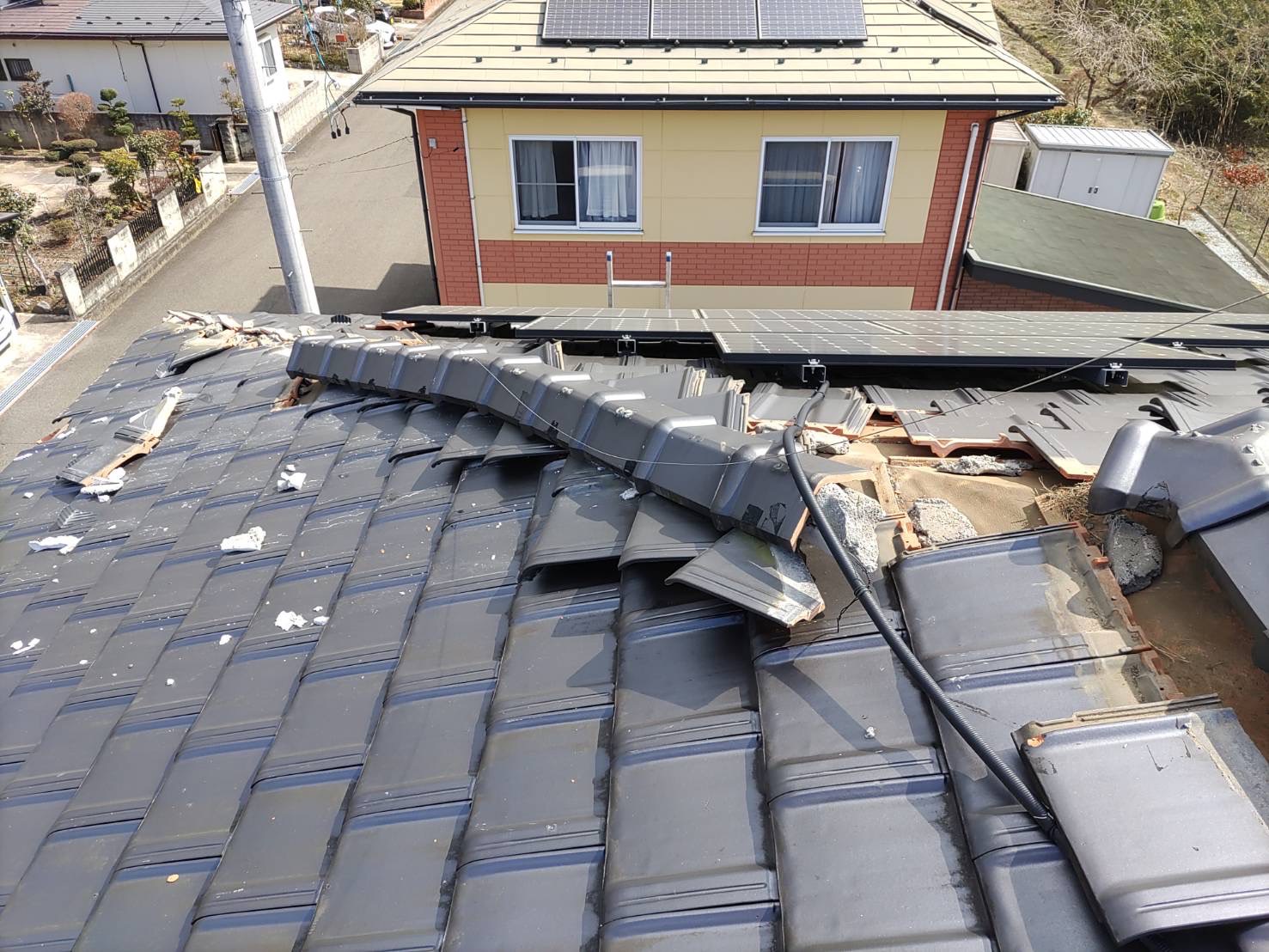 瓦も道路の中央まで落下して辺り一面瓦の破片が散乱してる状態でした。