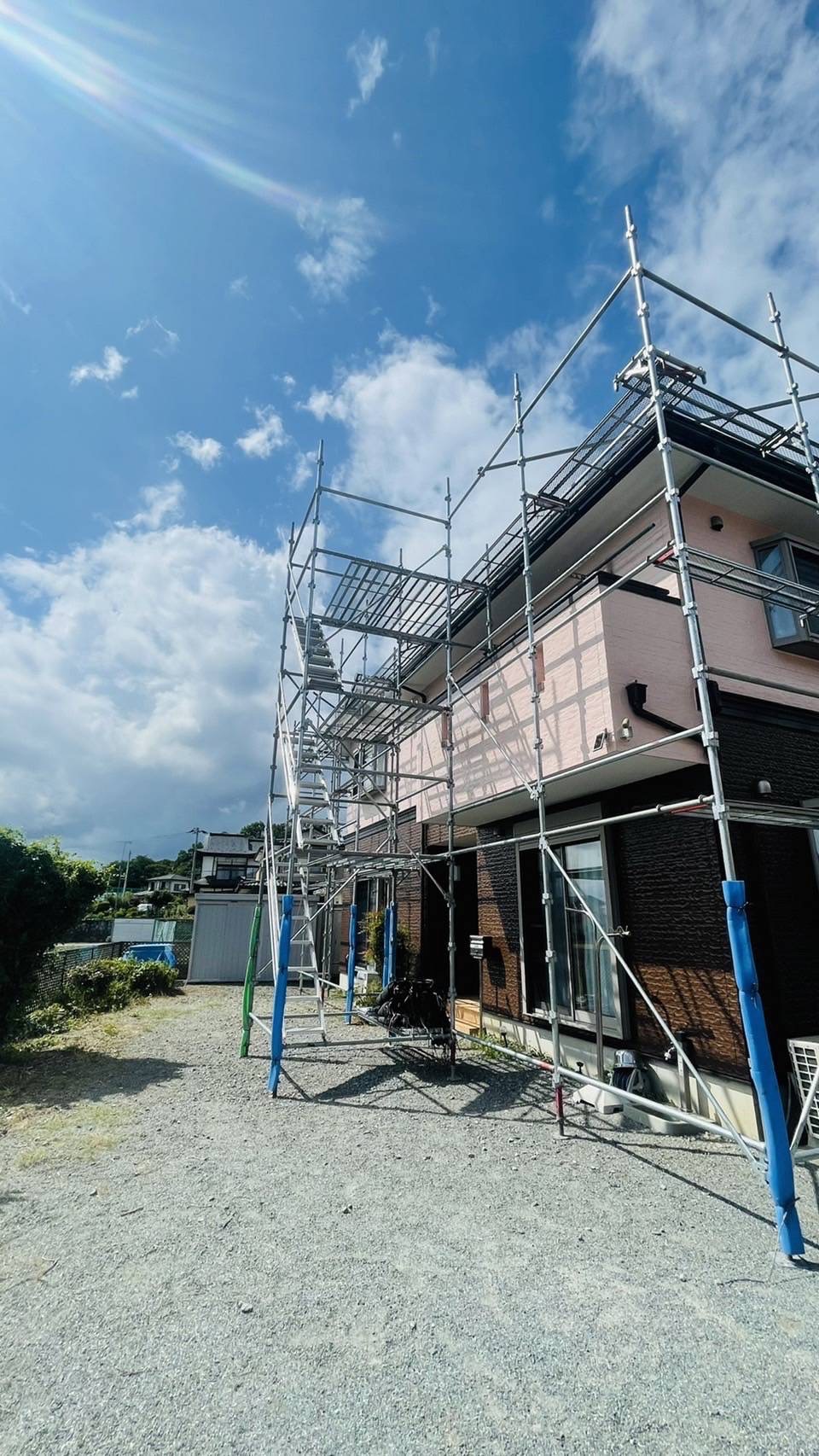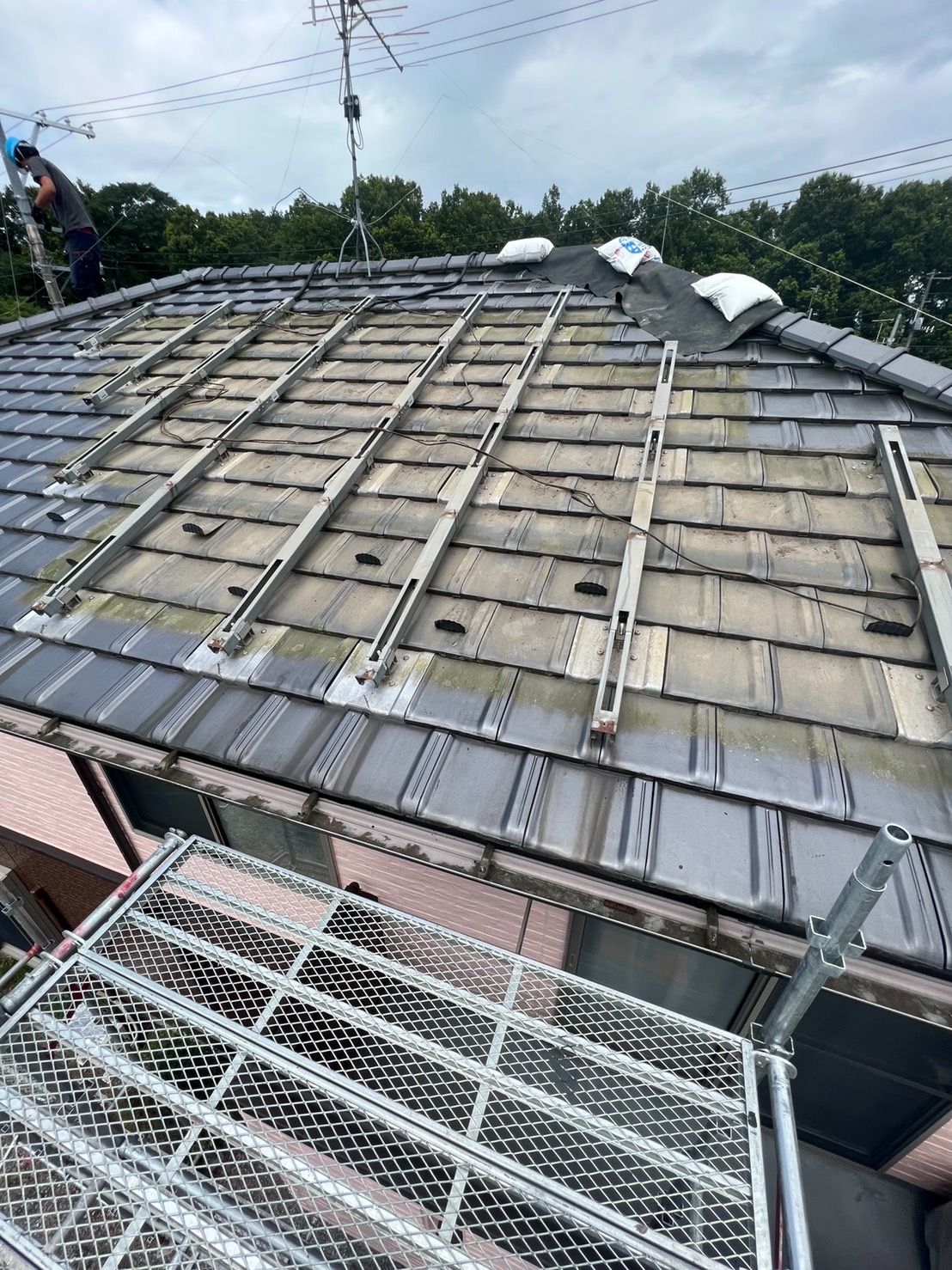 足場設置後、太陽光パネルを撤去。