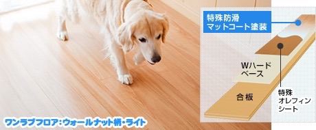 ヨダレやオシッコなどで床面が変色したり色落ちしたりする事が少ないステンガード機能。