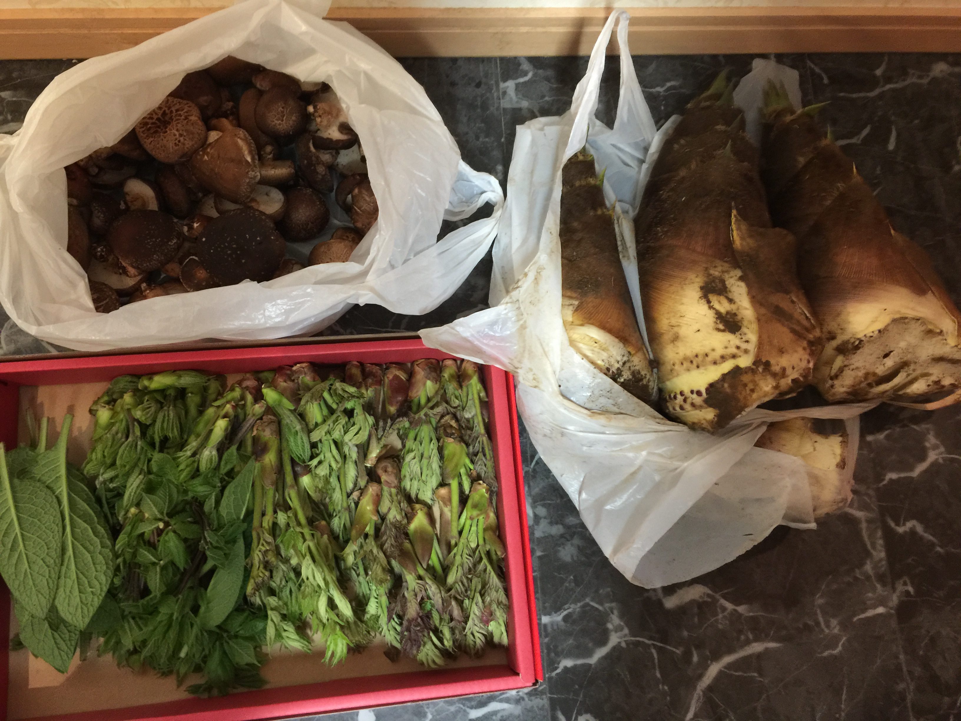 なんて…日々が続いておりましたが、今日は現在栃木市の大規模リノベーションの工事に入って下さっております宮大工の親方が、せっかくのお休みにもかかわらず、私のために筍、椎茸、たらの芽その他、たくさんの種類の山菜を採って来て届けて下さりました‼︎