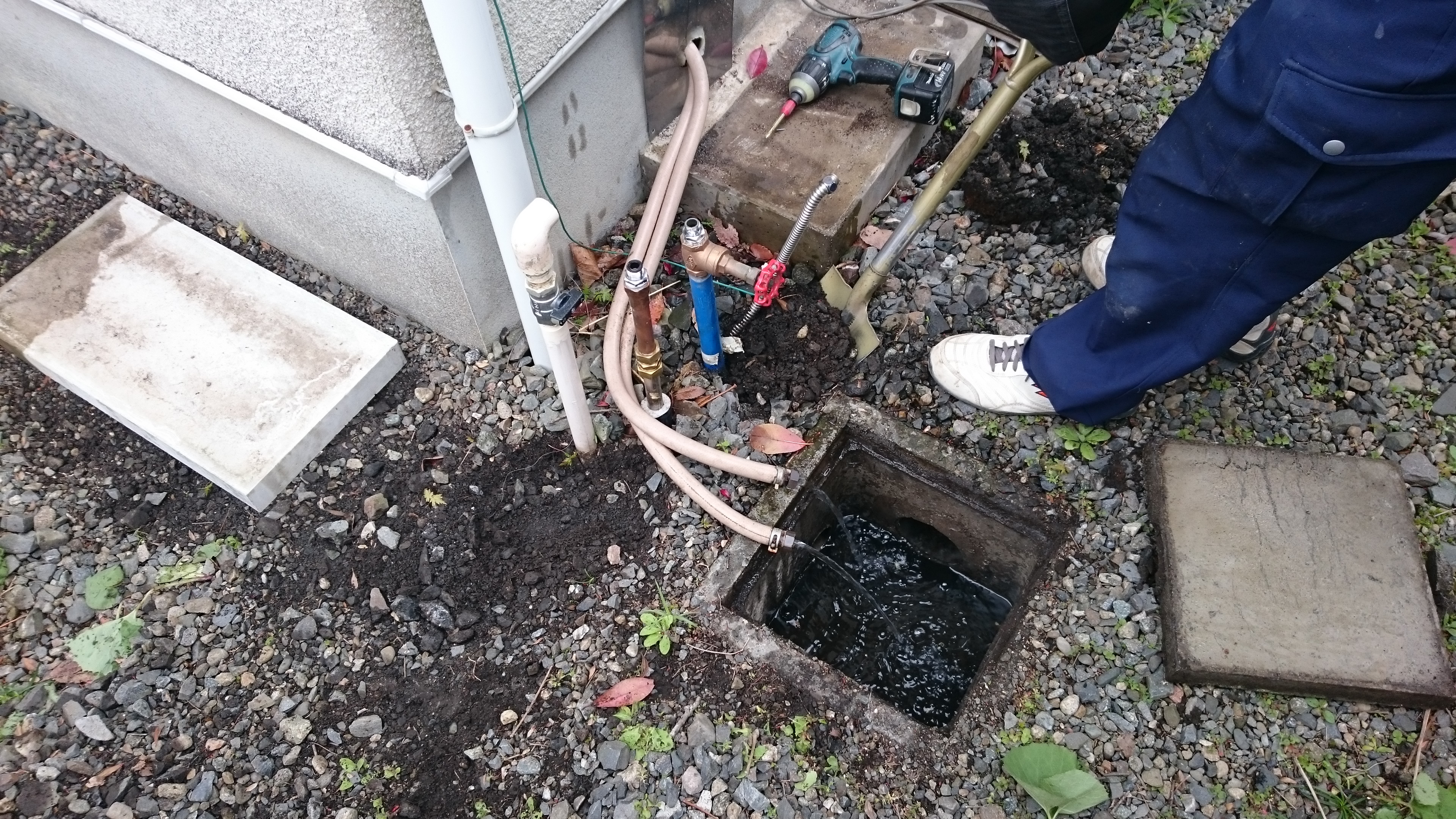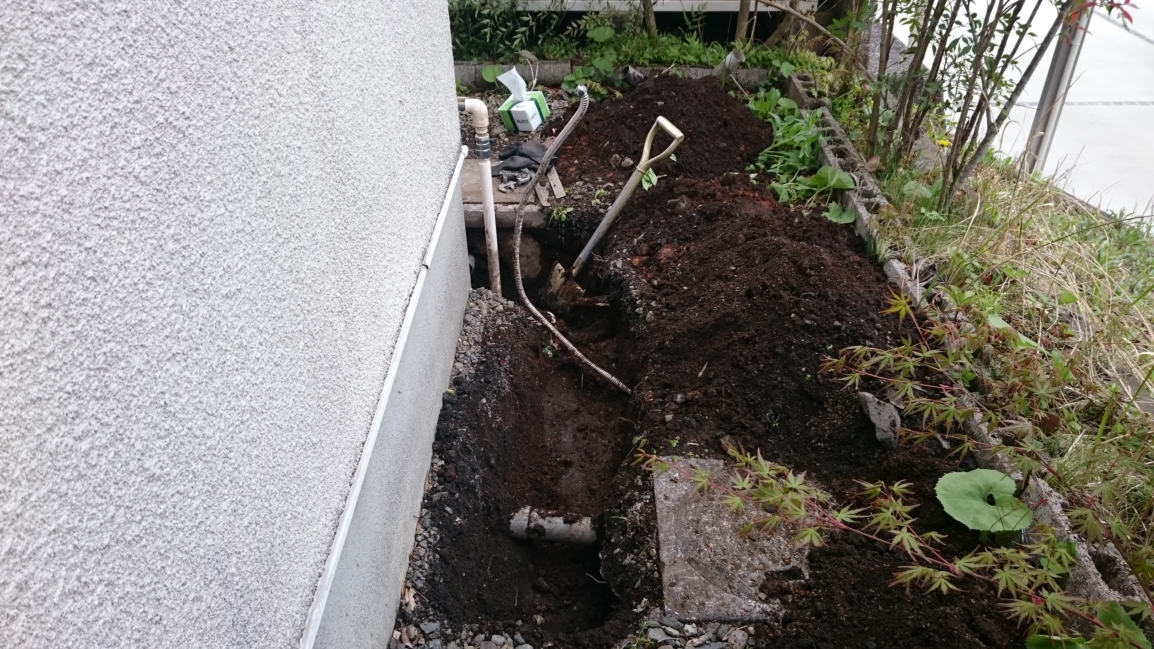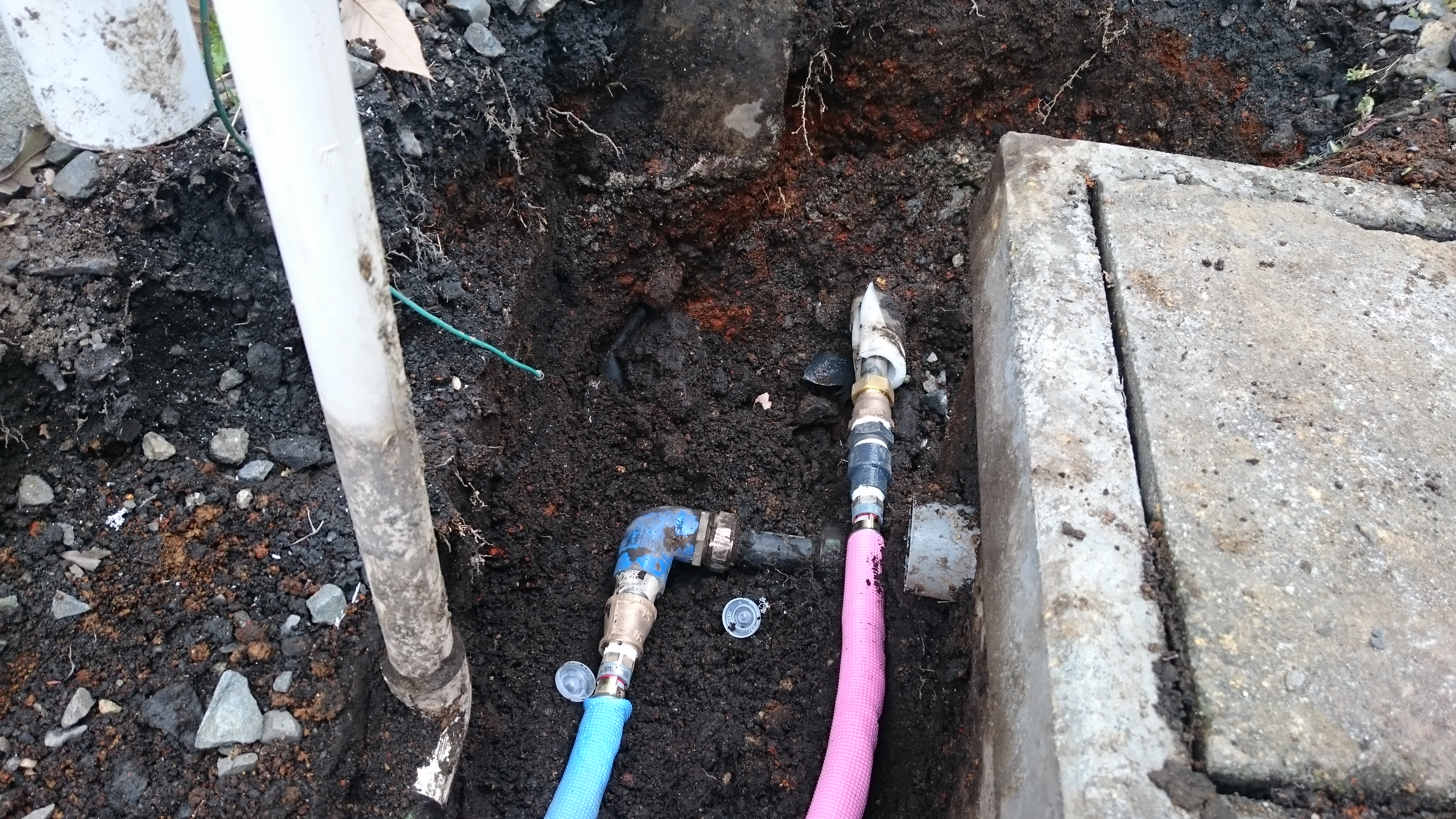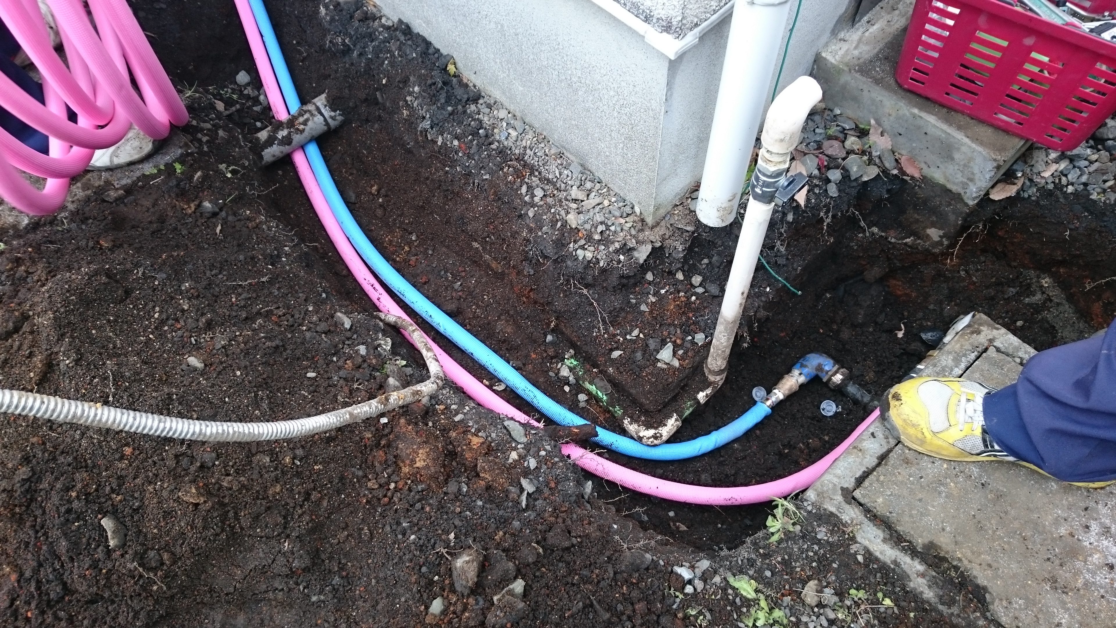 土を掘削して、フレキ管を反対へとふり直して、給水・給湯の架橋ポリを新規で埋設しました❗