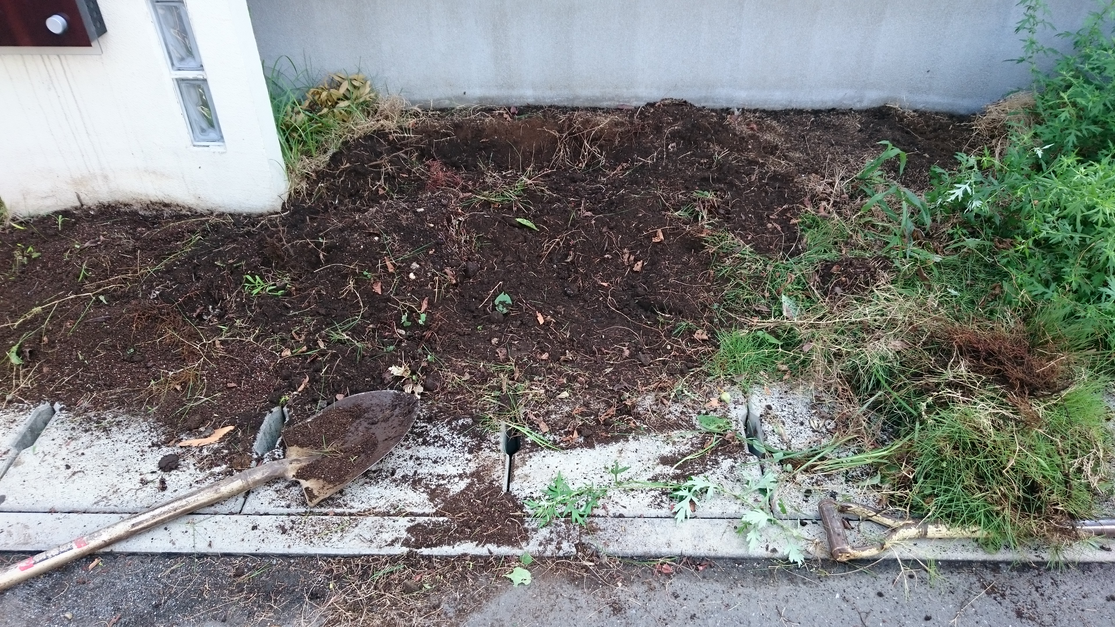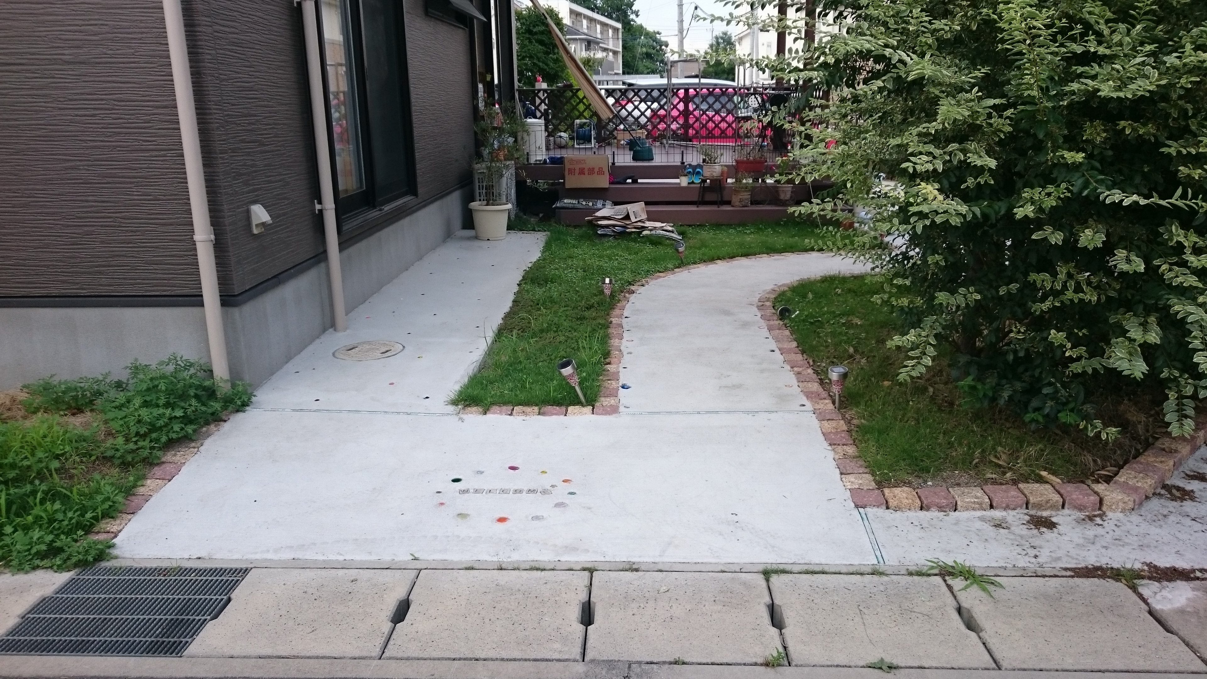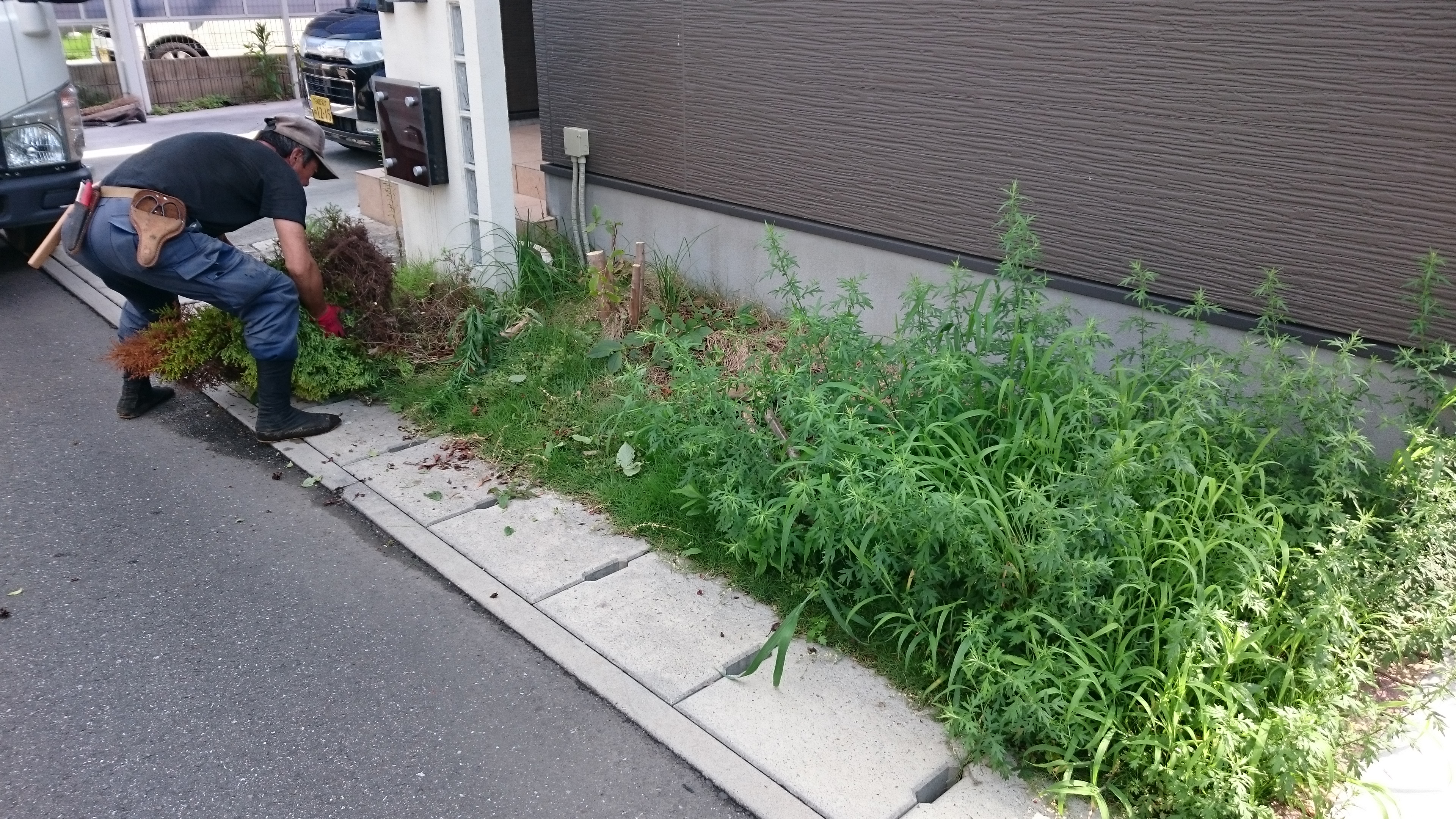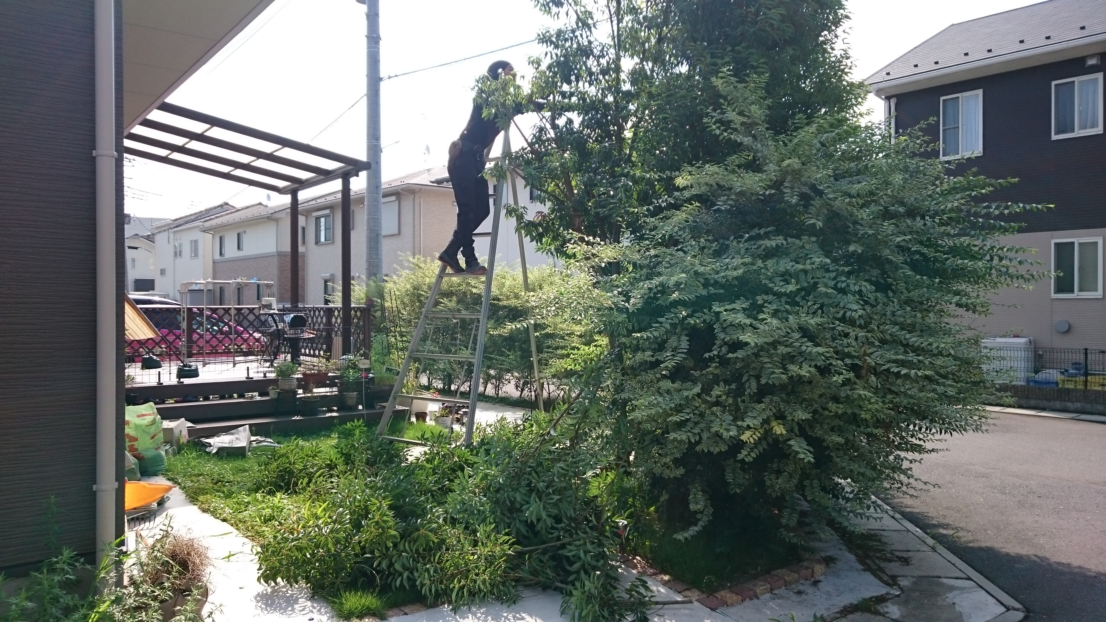 門柱廻りの木の抜根とお庭の剪定と芝撤去、そして、一部人工芝植え付けになります!