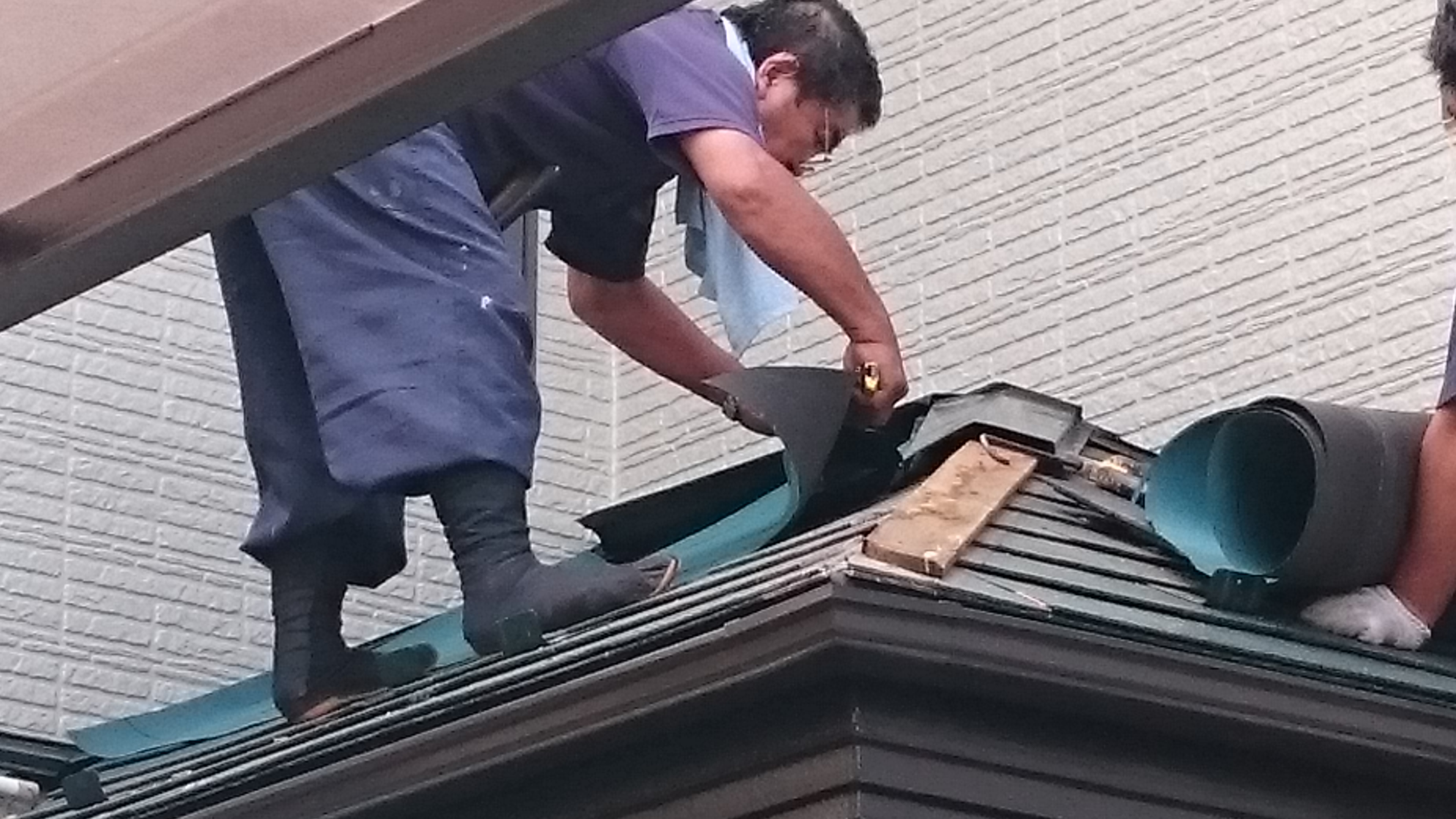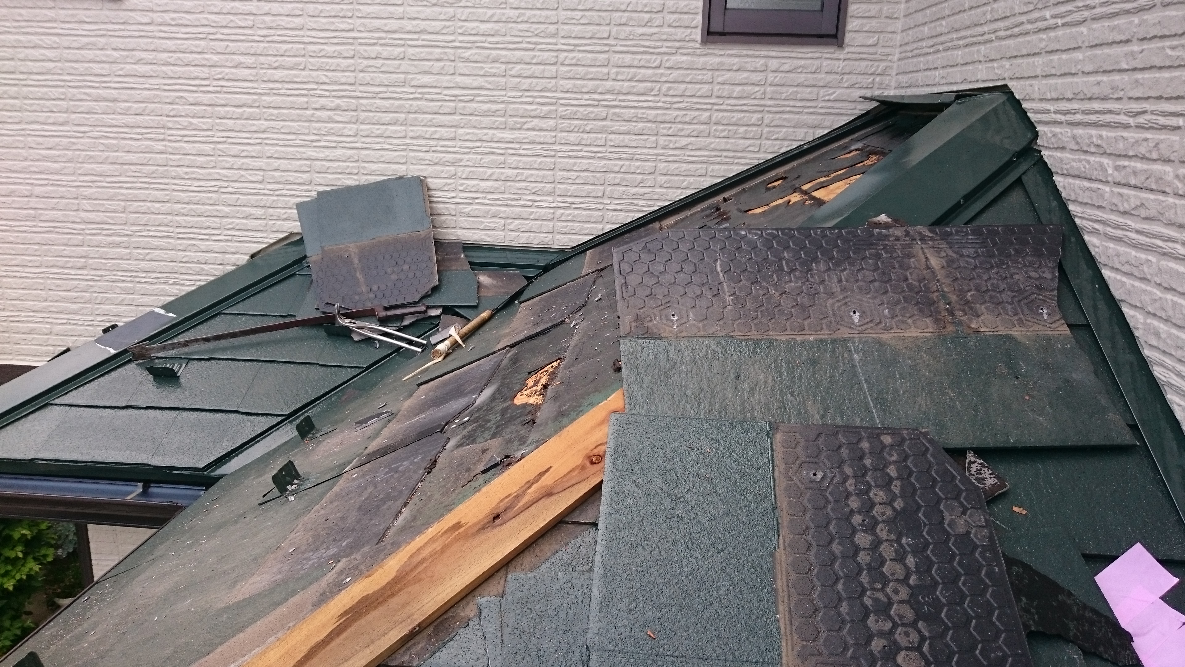 下地の防水シートが熱で溶けて、コロニアル裏面にこびりついてしまっていて、一枚を綺麗に剥がすことが大変困難な状況でした(>_<) その為、一枚剥がした時点で他の廻りのコロニアルにも影響を及ぼしてしまう現状です! ここで出来ることは、棟板金を外して貫板を一部掻いて、上から順にスレートを剥がして行くしか、手立てはありません^^; ここまで来たら、やるしかないのです!笑 結果ほぼ全てのコロニアルが熱防水シートにより、綺麗に剥がすことはできませんてました! DSC_1841