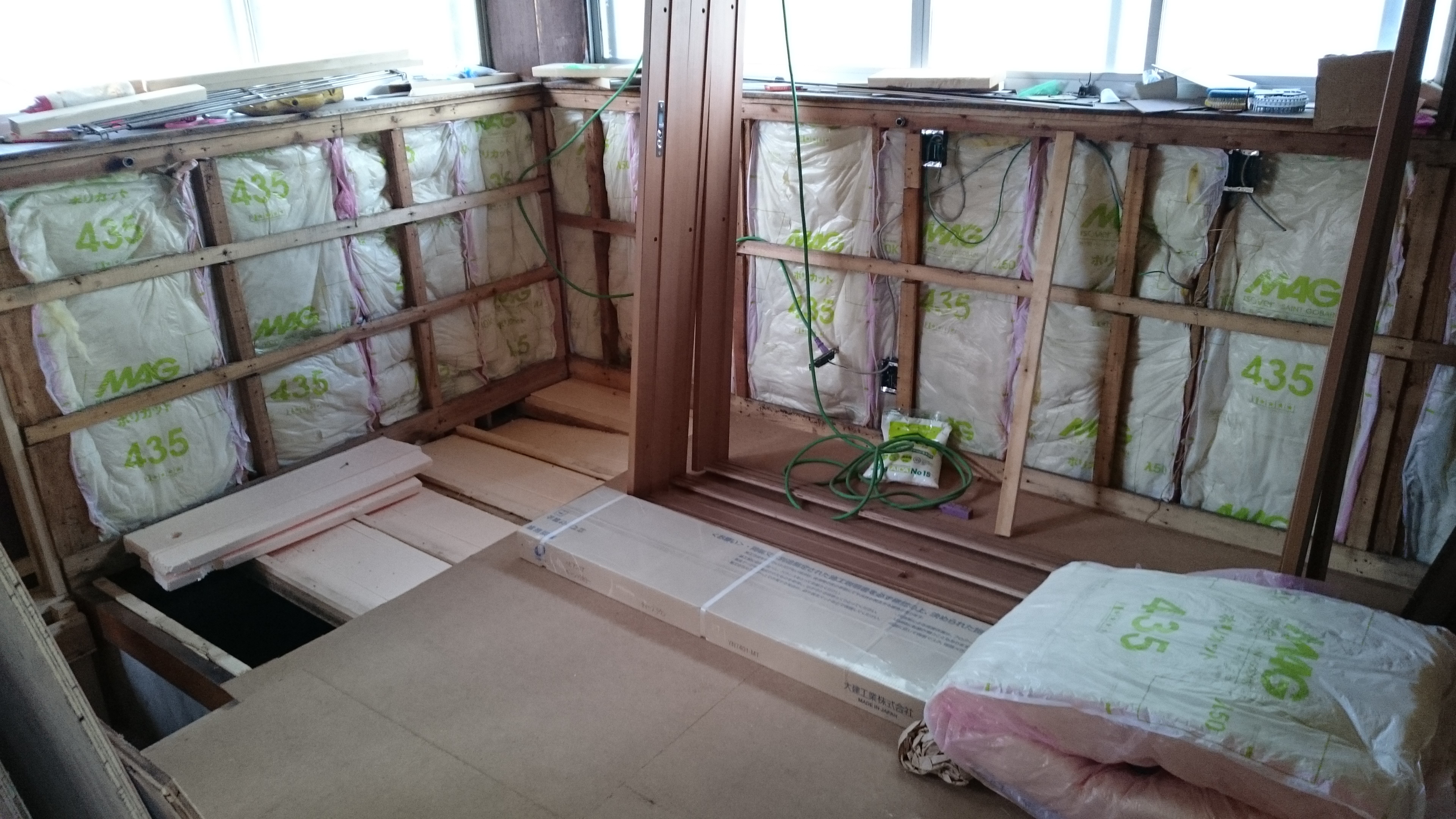 日光市のT様邸にて内装改修工事を行っておりますが、キッチンの裏壁に断熱材グラスウール100㎜を充填致しました😁❕❕