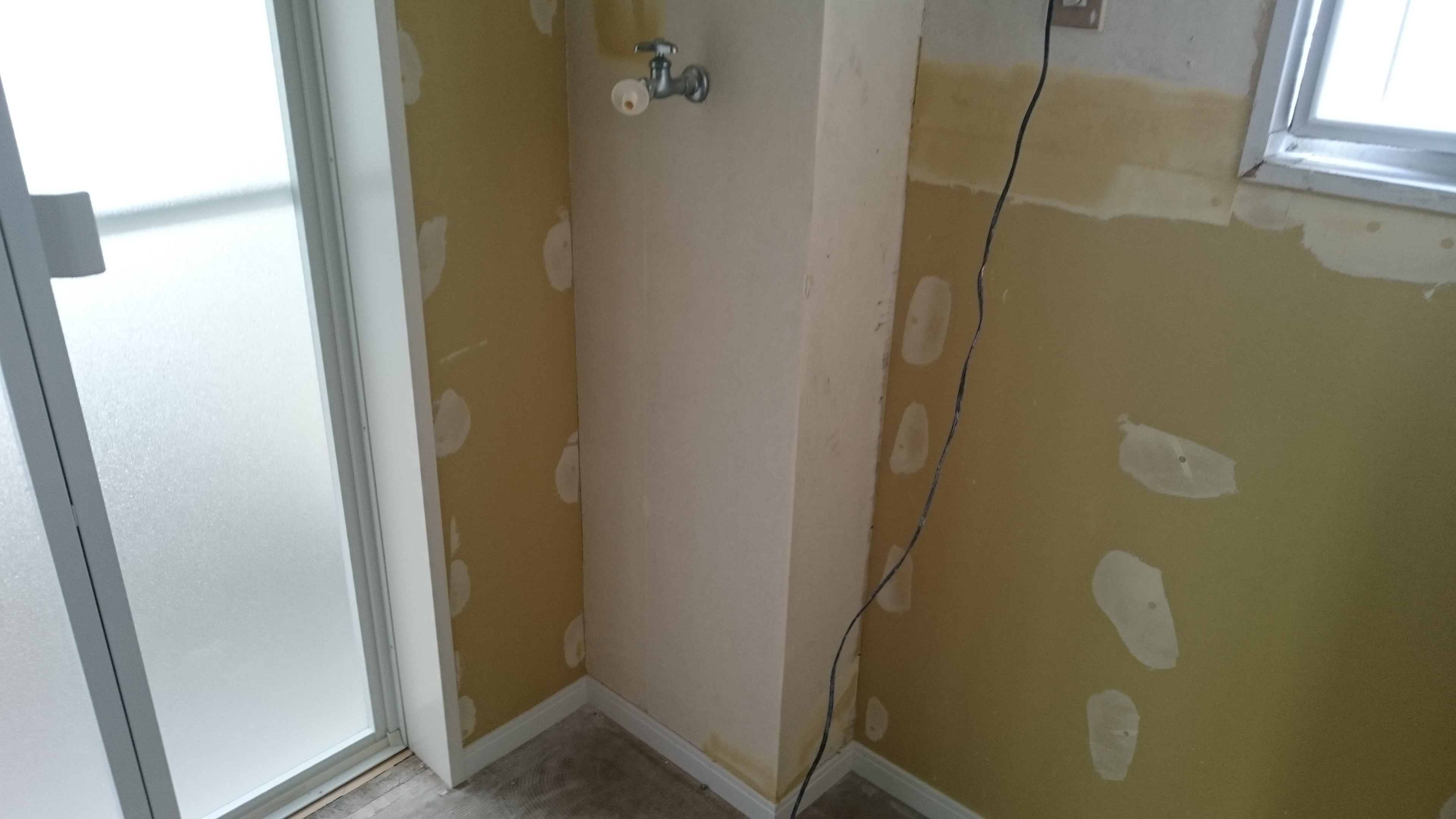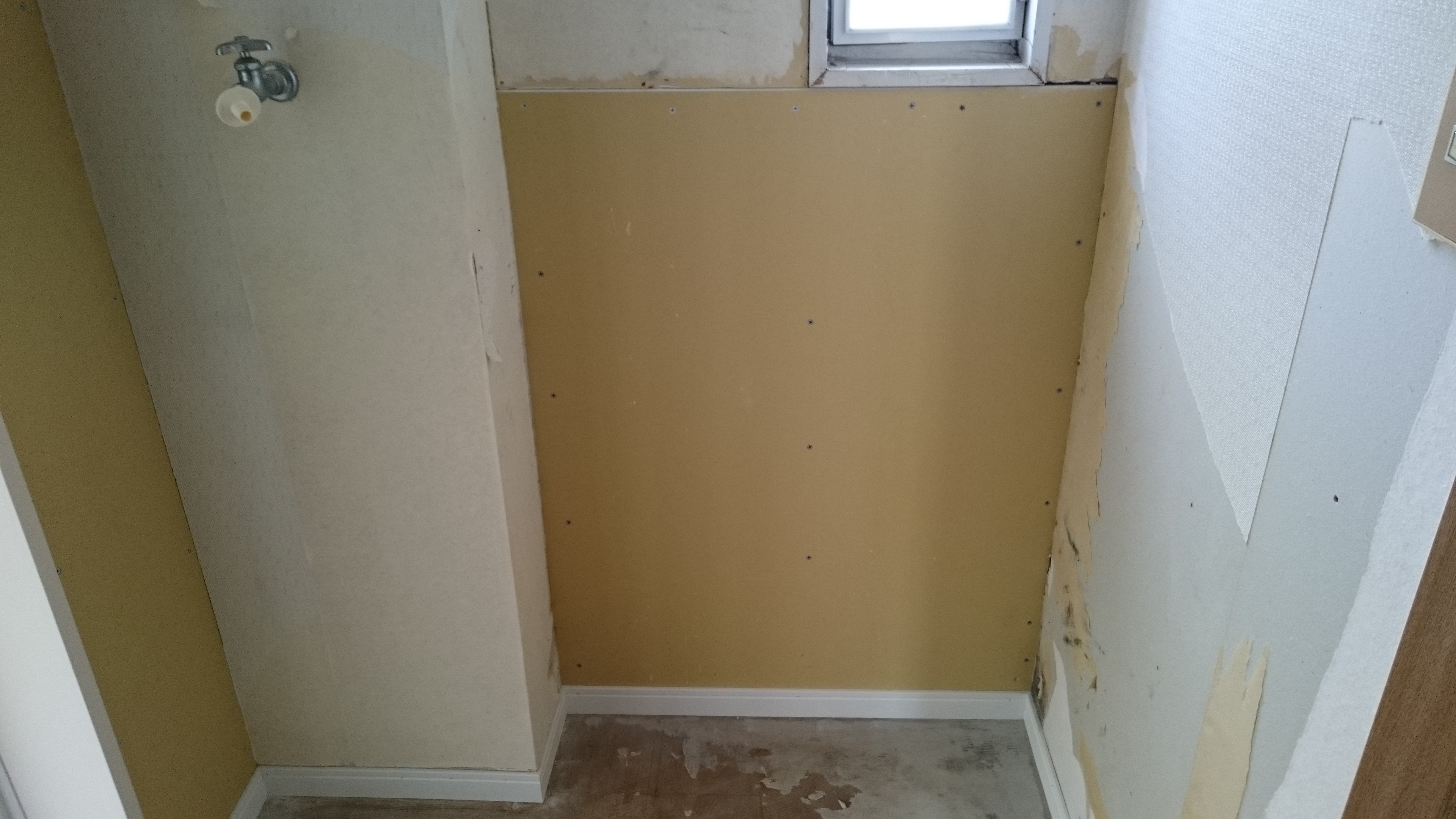 まず、新規化粧台で鏡や吊り戸の位置に下地を入れて、一部石膏ボードの腐食とカビがみられたので、交換等々行いました🎵