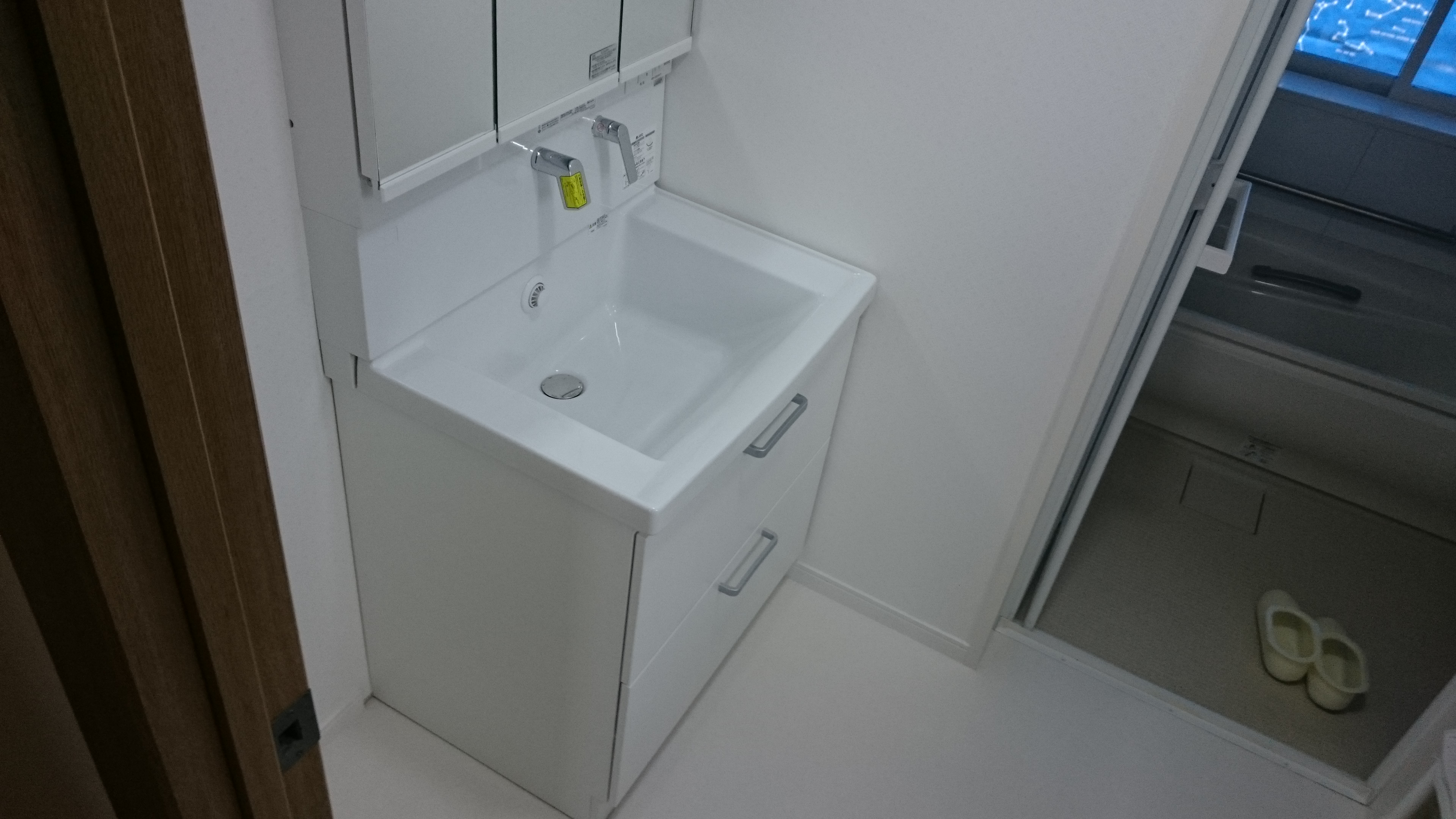 最後、設備屋さんにて、洗濯機戻し、新規化粧台取り付け完了です(*^^*)⤴